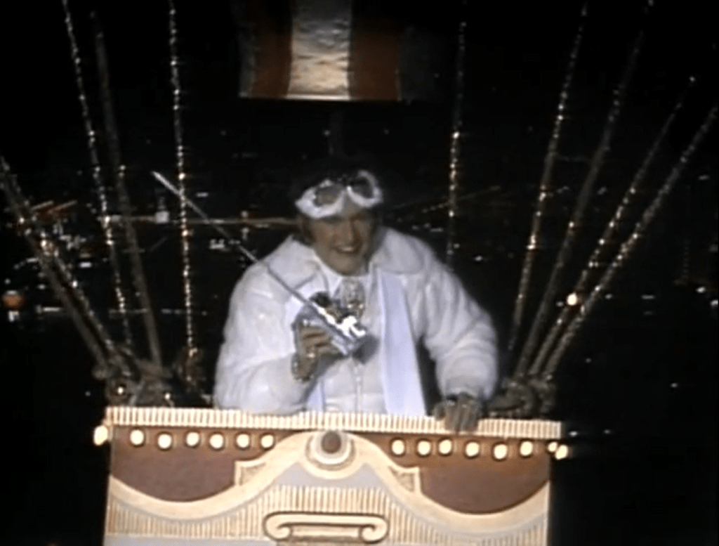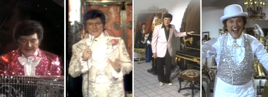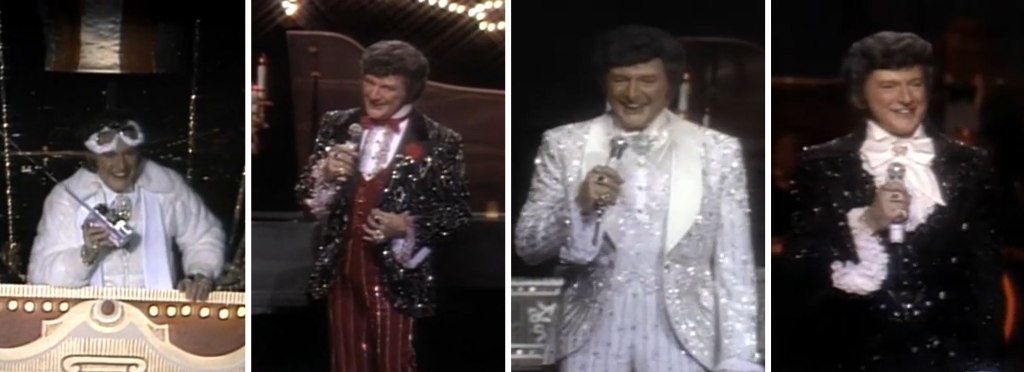 While none of the performances in this special are career stand-outs for Liberace, his endearing stage presence coupled with the show’s campy set-ups, fabulous costumes, and heart-themed decorations keep it fun and entertaining. Liberace’s entrance in a hot air balloon makes for one particularly great moment made even greater by the fur-trimmed flight goggles and mink jacket he arrives decked out in. “This has been one small step for man, and one giant step for a piano player from Milwaukee!” he declares after planting an American flag in the parking lot.