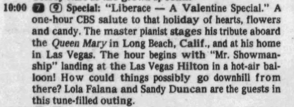 Happy Valentine’s Day! ❤️ On February 3rd, 1979 Liberace hosted his first and only Valentine’s Day special on CBS. Liberace – A Valentine Special aired at 10pm EST and featured guest stars Lola Falana and Sandy Duncan as Liberace’s friends and fellow performers.