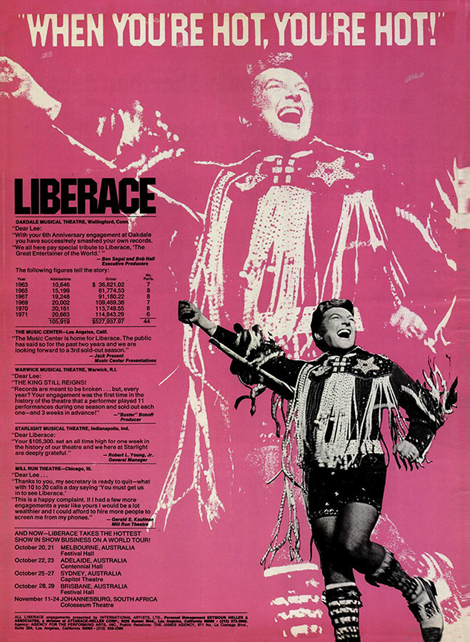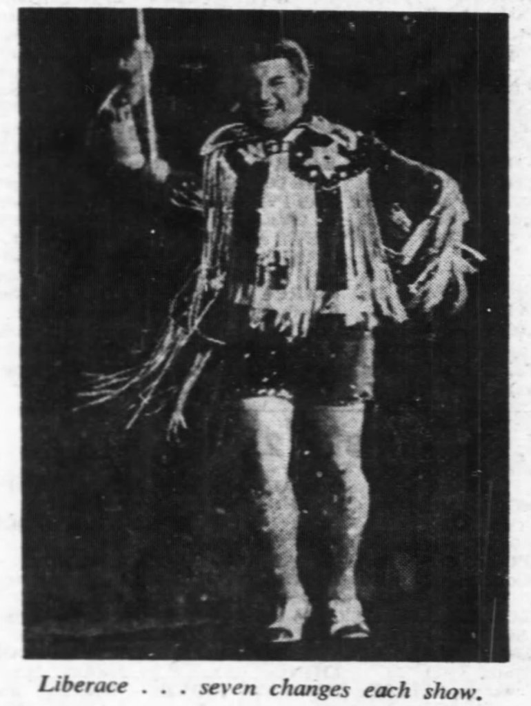 Eager to remain the undisputed king of all things camp and kitsch, Liberace formally premiered his sequined hot pants to a sold-out audience in Melbourne, Australia on October 20th, 1971.[3] Recounting the night in his autobiography, Liberace recalled that “there was no question about it, that hot pants outfit was certainly the campiest one I’d ever worn. I meant it to be! It had everything on it…a jacket hung with American Indian-type fringe…sequin-studded, knee-length sox, and the kind of two-toned oxfords that used to be spiffy back in the 30s. To top it off, I came on strutting like a majorette and twirling a baton. It should have lit up. Now, I think of it!”[4]