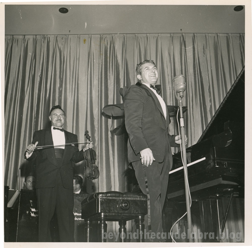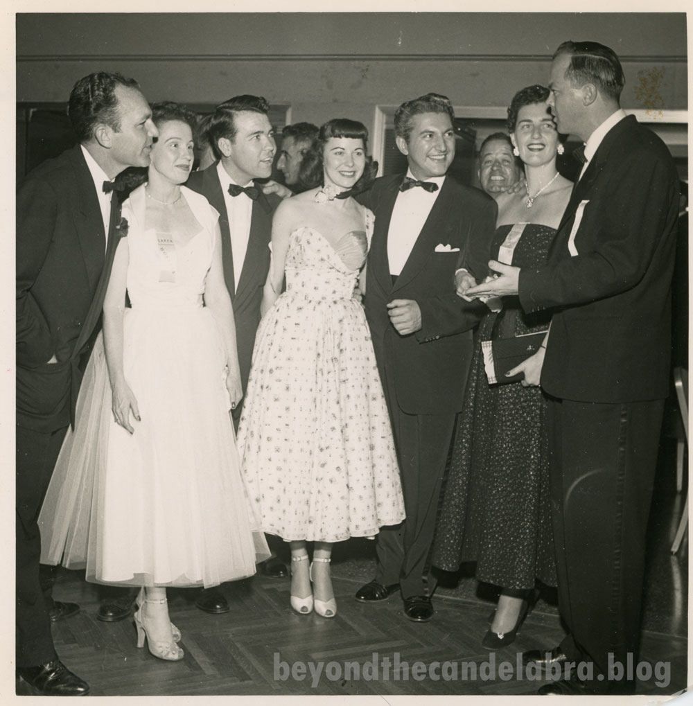 First founded in 1913, the Los Angeles Press Club is a journalism organization which exists to “support, promote, and defend quality journalism in Southern California.”1 While I wasn’t able to find much information about what specific Press Club event Liberace and George were performing at in 1954, inscriptions on the back of the photos indicate that it was attended by former child star Delmar Watson, LA restaurateur Bill Binder, and various journalists from across the country.