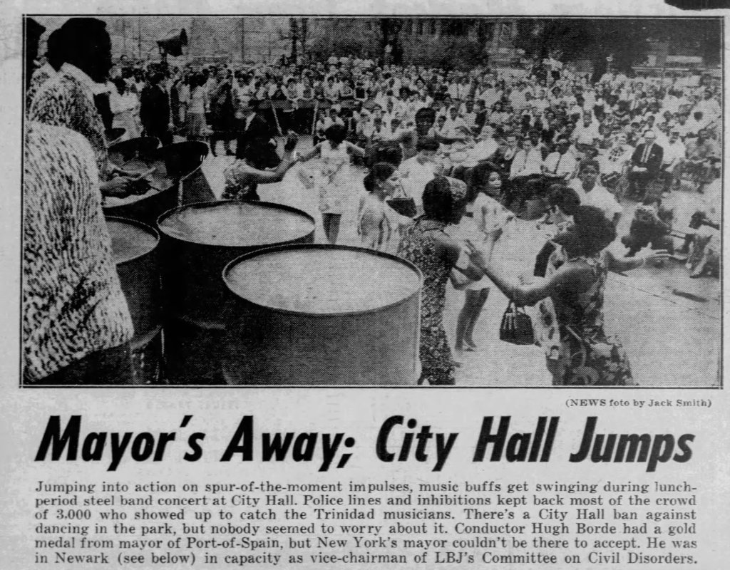 This invitation would put the band in direct contact with Liberace who happened to catch one of their “dazzling” performances while visiting the Fair during his own tour of Canada.6 At the time, steel drum music was largely unknown outside of the Caribbean where it had evolved from a “nuisance” pass-time for the young and the poor to a powerful symbol of resistance to British rule.78 “The [British] navy used a lot of oil,” one steel drum musician explained to NPR in 2005, “[so] thousands of [oil] drums [would] pile up in the back of their warehouse a mile high. When the guards were all gone, we would go down there as young boys and steal the drums away from the navy base and run away with them [to use as instruments].”9